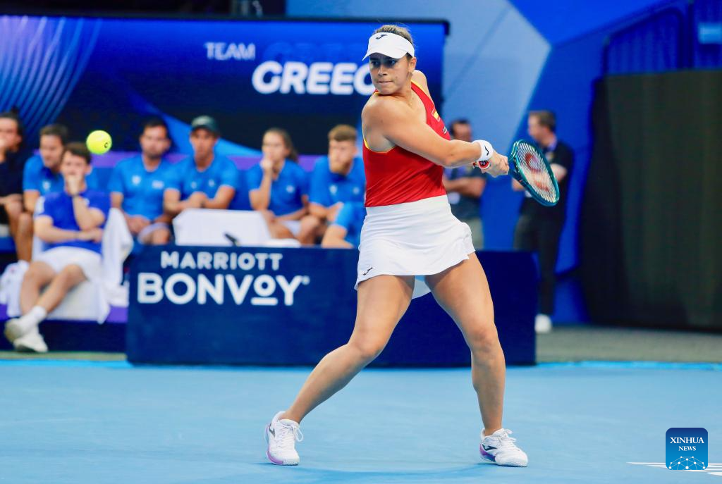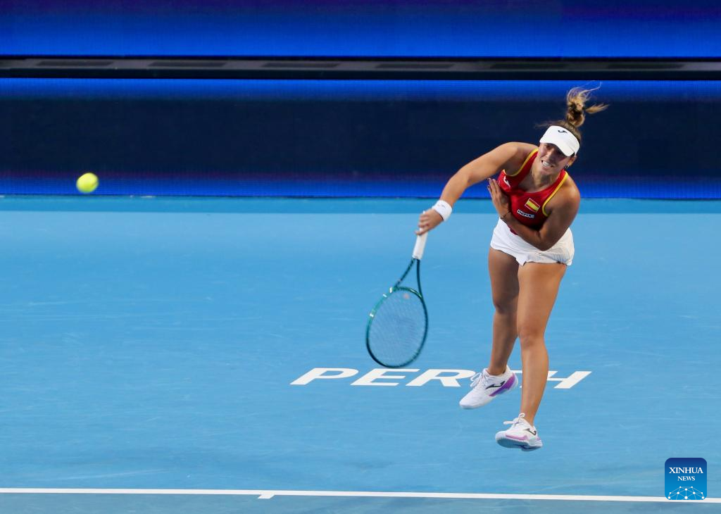 Jessica Bouzas Maneiro of Spain hits a return during the women's singles match against Maria Sakkari of Greece in the Group C round robin match between Greece and Spain at the 2025 United Cup tennis tournament in Perth, Australia, Dec. 28, 2024. (Photo by Zhou Dan/Xinhua)