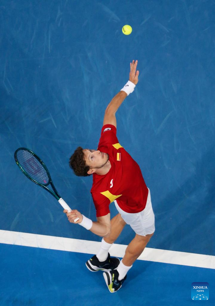 Pablo Carreno Busta of Spain serves during the men's singles match against Stefanos Tsitsipas of Greece in the Group C round robin match between Greece and Spain at the 2025 United Cup tennis tournament in Perth, Australia, Dec. 28, 2024. (Photo by Zhou Dan/Xinhua)