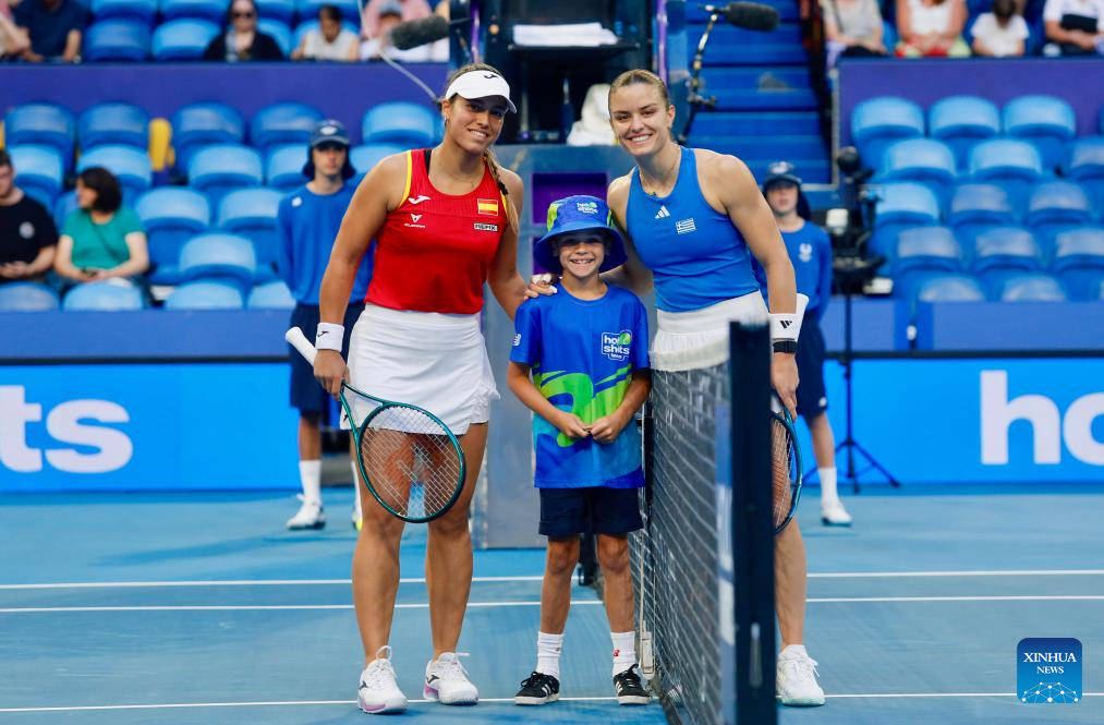 Maria Sakkari (R) of Greece and Jessica Bouzas Maneiro of Spain pose for photo before the women's singles match in the Group C round robin match between Greece and Spain at the 2025 United Cup tennis tournament in Perth, Australia, Dec. 28, 2024. (Photo by Zhou Dan/Xinhua)