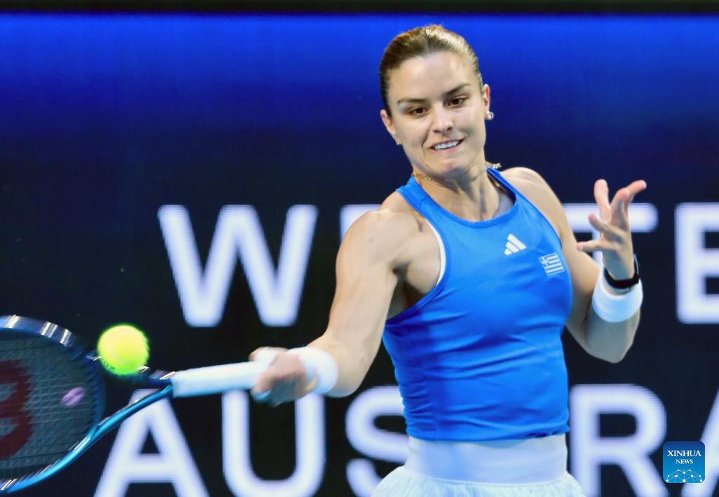 Maria Sakkari of Greece hits a return during the women's singles match against Jessica Bouzas Maneiro of Spain in the Group C round robin match between Greece and Spain at the 2025 United Cup tennis tournament in Perth, Australia, Dec. 28, 2024. (Photo by Zhou Dan/Xinhua)