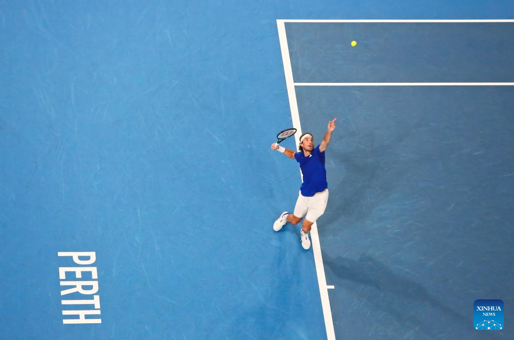 Stefanos Tsitsipas of Greece serves during the men's singles match against Pablo Carreno Busta of Spain in the Group C round robin match between Greece and Spain at the 2025 United Cup tennis tournament in Perth, Australia, Dec. 28, 2024. (Photo by Zhou Dan/Xinhua)