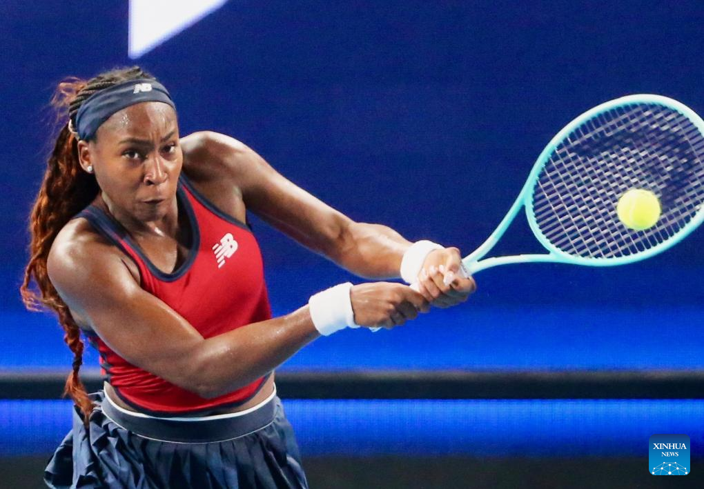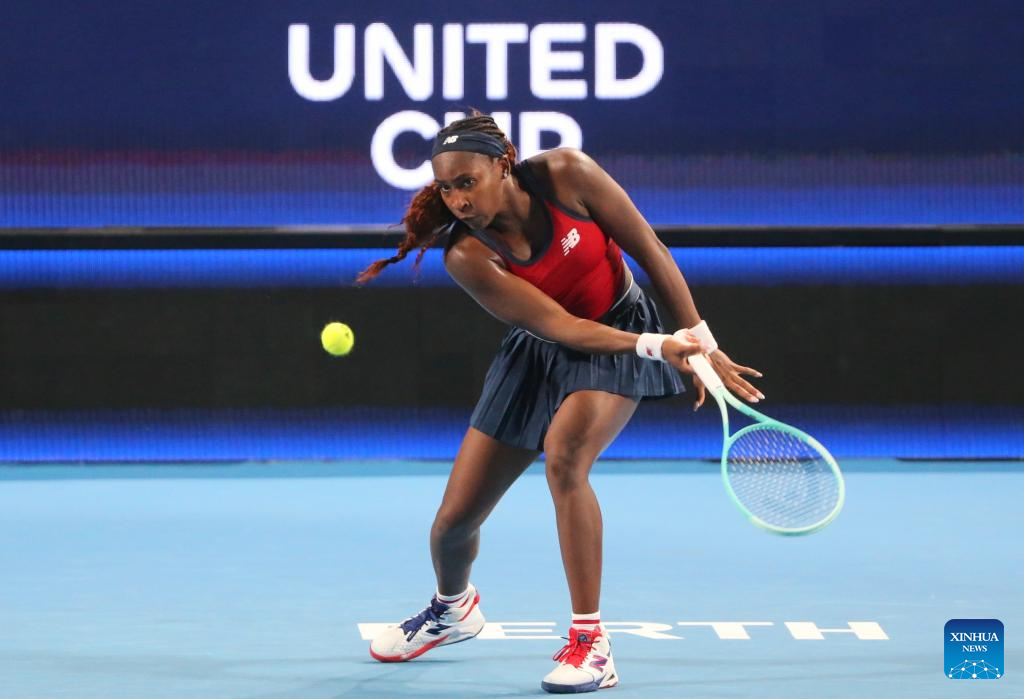 Coco Gauff of the United States hits a return during the women's singles match against Leylah Fernandez of Canada in the Group A round robin match between the United States and Canada at the 2025 United Cup tennis tournament in Perth, Australia, Dec. 29, 2024. (Photo by Zhou Dan/Xinhua)