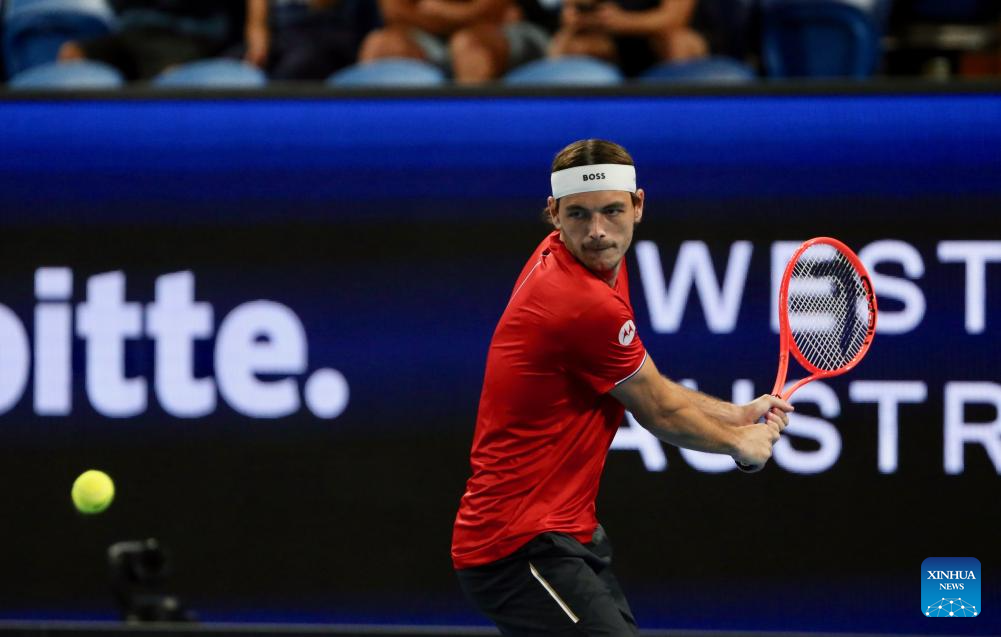 Taylor Fritz of the United States hits a return during the men's singles match against Felix Auger-Aliassime of Canada in the Group A round robin match between the United States and Canada at the 2025 United Cup tennis tournament in Perth, Australia, Dec. 29, 2024. (Photo by Zhou Dan/Xinhua)