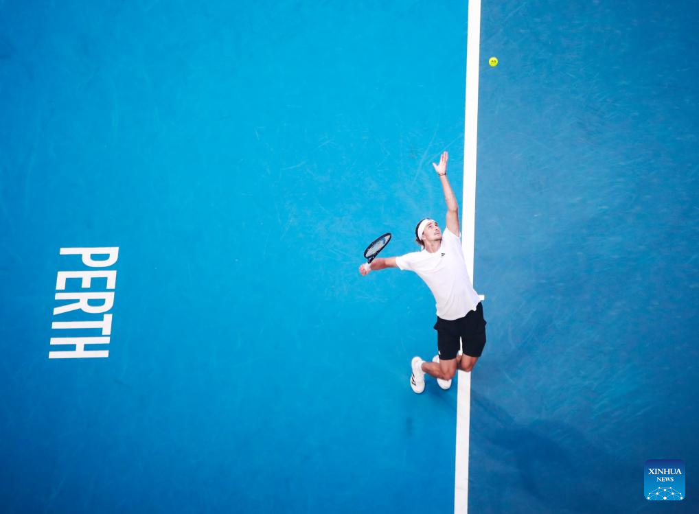 Alexander Zverev of Germany serves during the men's singles match against Zhang Zhizhen of China in the Group E round robin match between China and Germany at the 2025 United Cup tennis tournament in Perth, Australia, Dec. 30, 2024. (Xinhua/Ma Ping)