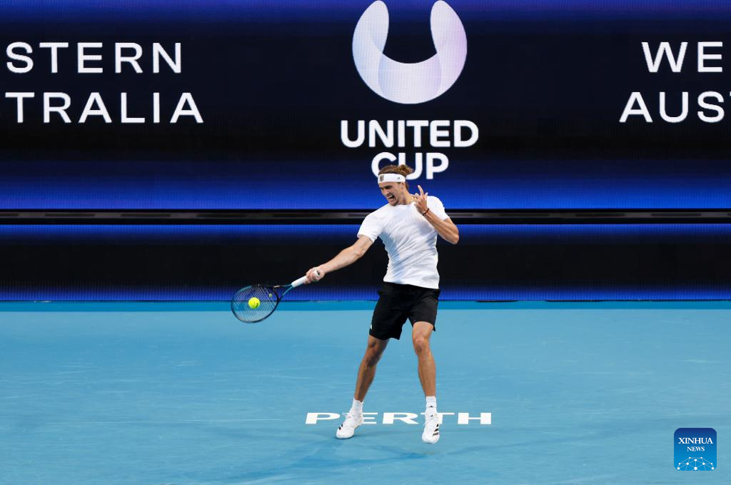 Alexander Zverev of Germany hits a return during the men's singles match against Zhang Zhizhen of China in the Group E round robin match between China and Germany at the 2025 United Cup tennis tournament in Perth, Australia, Dec. 30, 2024. (Xinhua/Ma Ping)