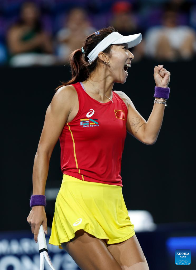 Gao Xinyu of China celebrates winning the women's singles match against Laura Siegemund of Germany in the Group E round robin match between China and Germany at the 2025 United Cup tennis tournament in Perth, Australia, Dec. 30, 2024. (Xinhua/Ma Ping)