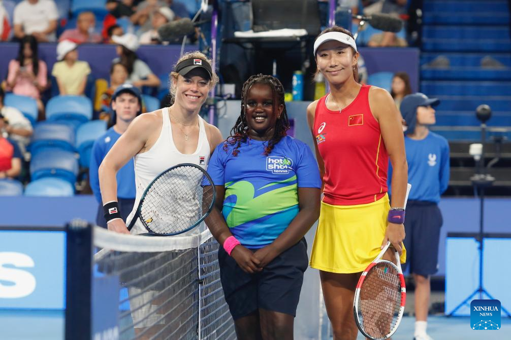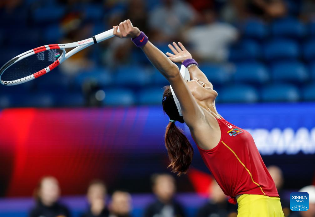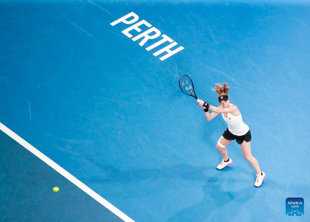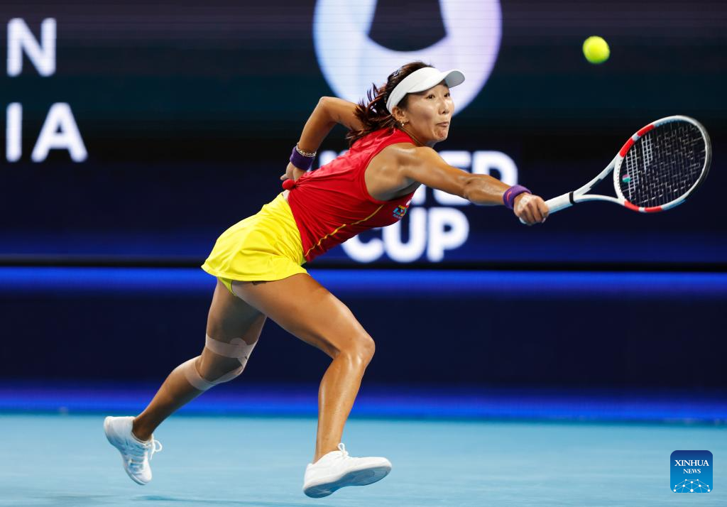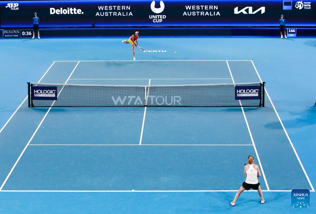 Gao Xinyu of China hits a return during the women's singles match against Laura Siegemund of Germany in the Group E round robin match between China and Germany at the 2025 United Cup tennis tournament in Perth, Australia, Dec. 30, 2024. (Xinhua/Ma Ping)