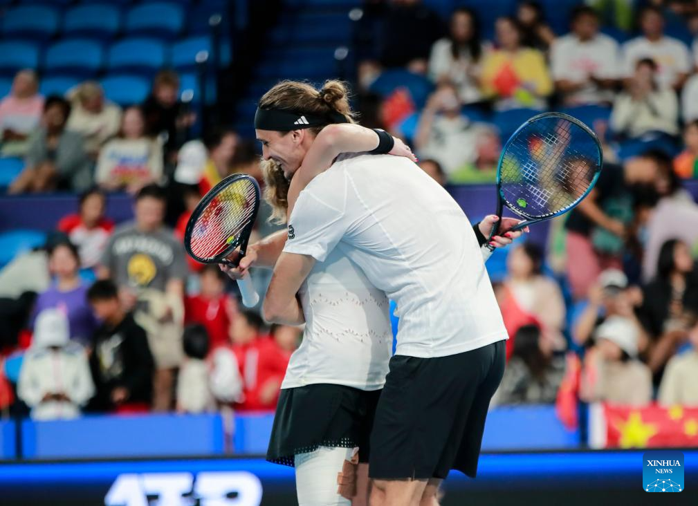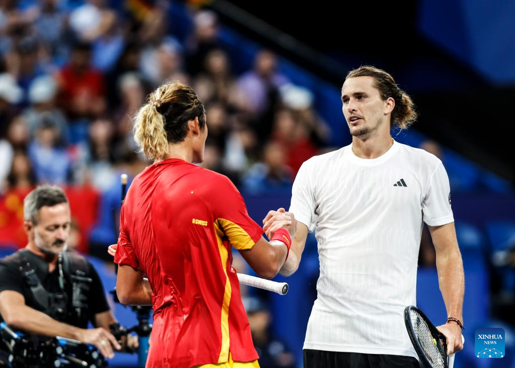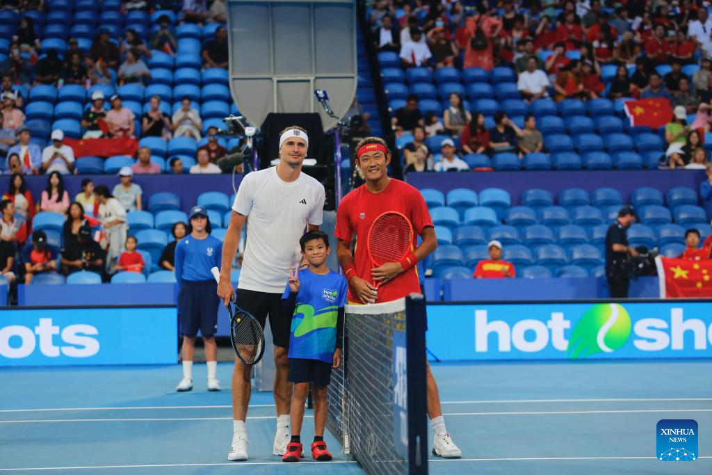 Zhang Zhizhen (L) of China greets Alexander Zverev of Germany after their men's singles match in the Group E round robin match between China and Germany at the 2025 United Cup tennis tournament in Perth, Australia, Dec. 30, 2024. (Xinhua/Ma Ping)
