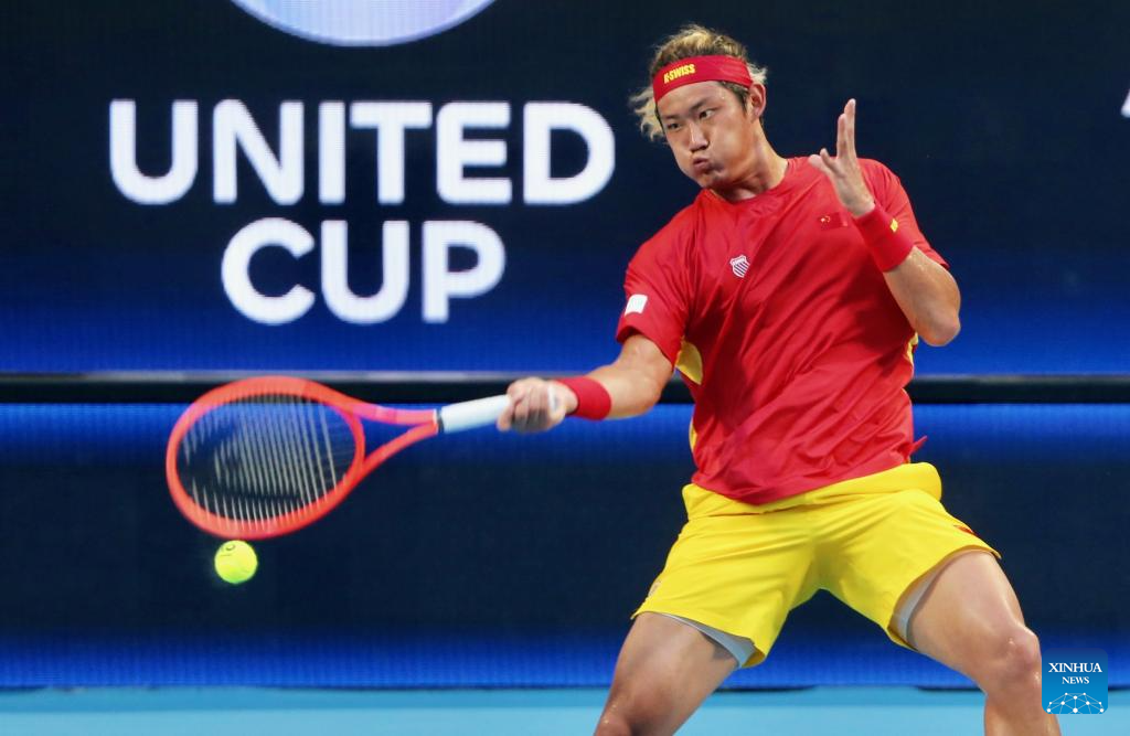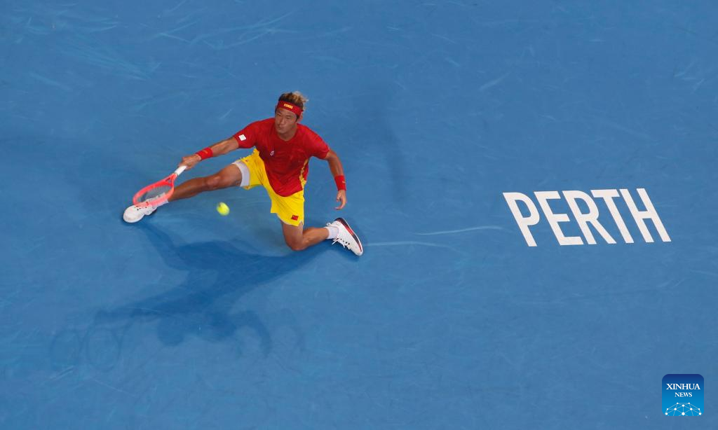 Zhang Zhizhen of China hits a return during the men's singles match against Alexander Zverev of Germany in the Group E round robin match between China and Germany at the 2025 United Cup tennis tournament in Perth, Australia, Dec. 30, 2024. (Photo by Zhou Dan/Xinhua)