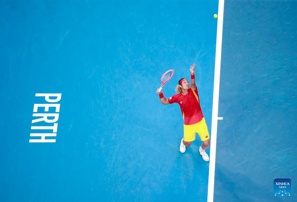 Zhang Zhizhen of China serves during the men's singles match against Alexander Zverev of Germany in the Group E round robin match between China and Germany at the 2025 United Cup tennis tournament in Perth, Australia, Dec. 30, 2024. (Xinhua/Ma Ping)