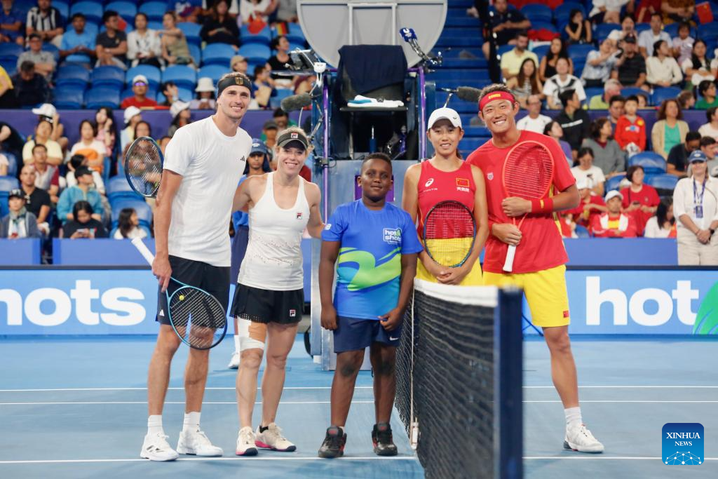 Laura Siegemund (2nd L)/Alexander Zverev(1st L) of Germany pose for photos with Zhang Shuai(2nd R)/Zhang Zhizhen of China before the mixed doubles match in the Group E round robin match between China and Germany at the 2025 United Cup tennis tournament in Perth, Australia, Dec. 30, 2024. (Photo by Zhou Dan/Xinhua)