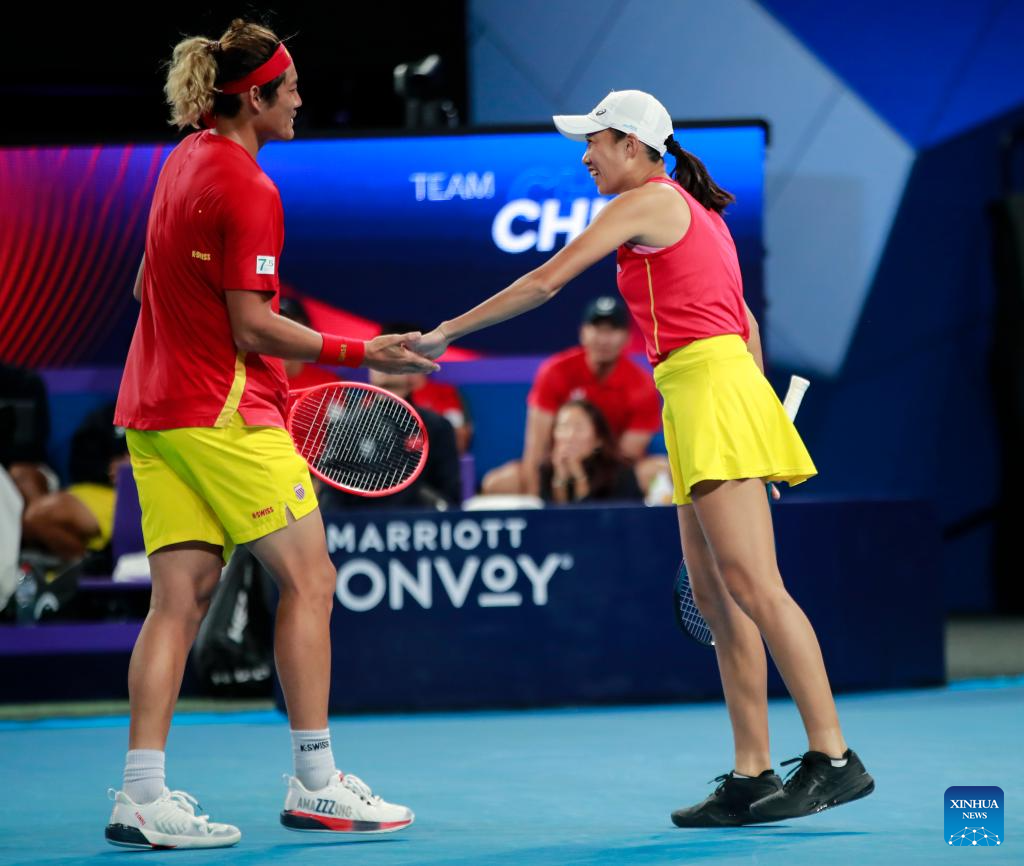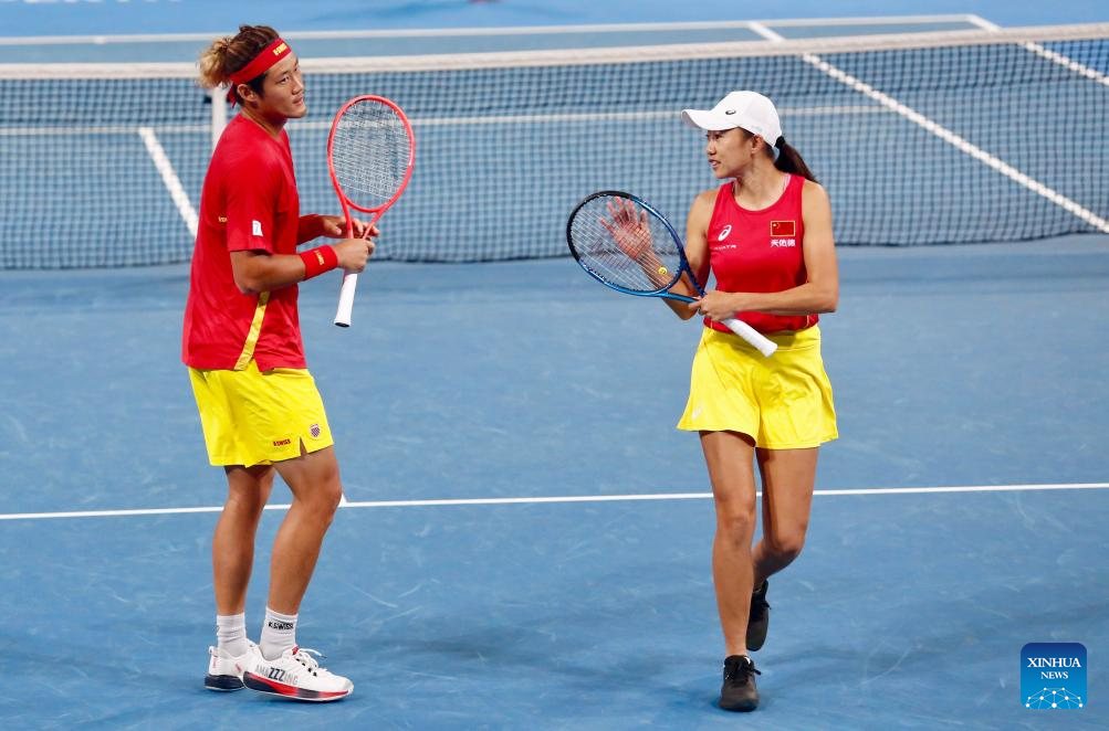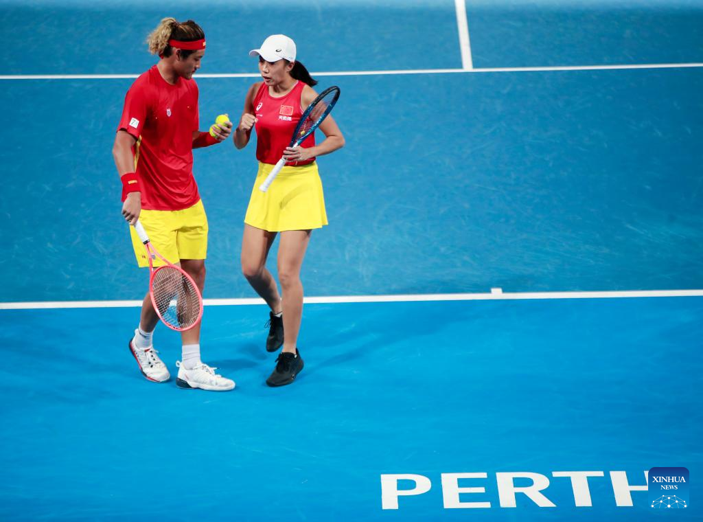 Zhang Shuai (R)/Zhang Zhizhen of China react during the mixed doubles match against Laura Siegemund/Alexander Zverev of Germany in the Group E round robin match between China and Germany at the 2025 United Cup tennis tournament in Perth, Australia, Dec. 30, 2024. (Xinhua/Ma Ping)