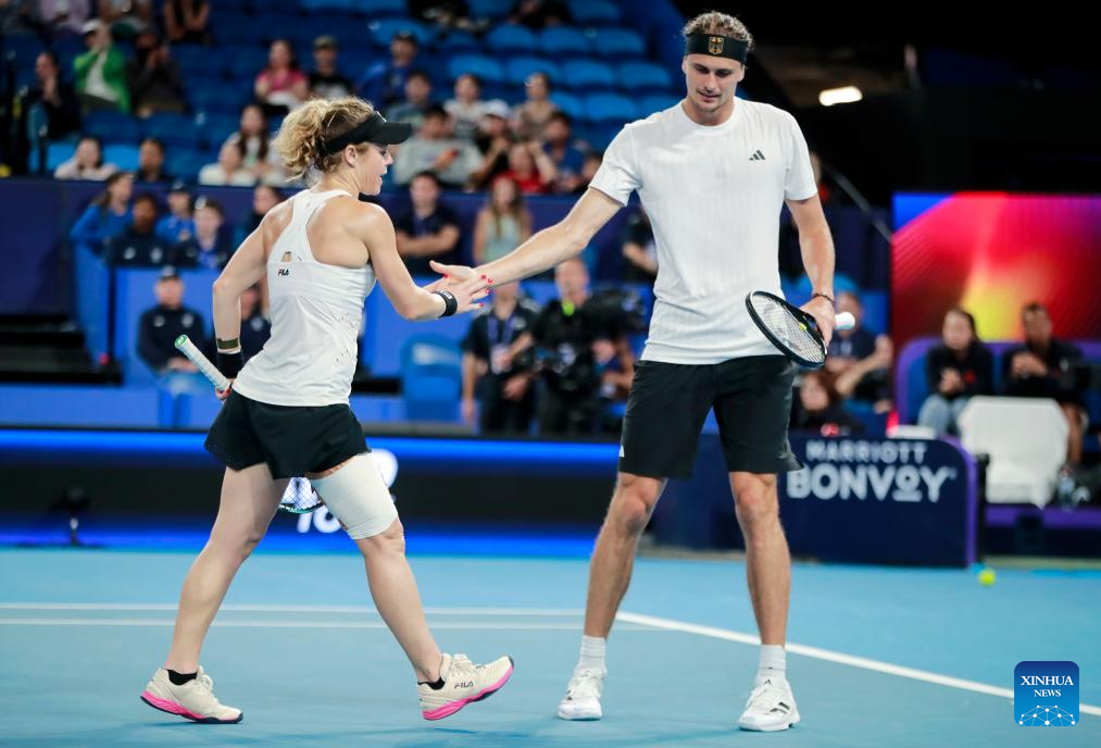 Laura Siegemund (L)/Alexander Zverev of Germany celebrate after winning the mixed doubles match against Zhang Shuai/Zhang Zhizhen of China in the Group E round robin match between China and Germany at the 2025 United Cup tennis tournament in Perth, Australia, Dec. 30, 2024. (Xinhua/Ma Ping)