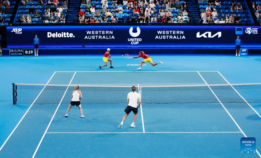 Zhang Shuai(Top L)/Zhang Zhizhen(Top R) of China compete during the mixed doubles match against Laura Siegemund (Bottom L)/Alexander Zverev of Germany in the Group E round robin match between China and Germany at the 2025 United Cup tennis tournament in Perth, Australia, Dec. 30, 2024. (Xinhua/Ma Ping)