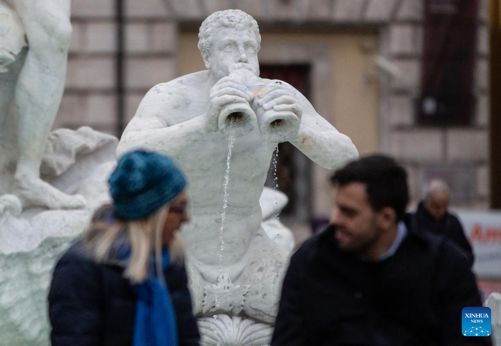 People visit the Fountain of Neptune at Piazza Navona in Rome, Italy, Dec. 24, 2024. (Xinhua/Li Jing)