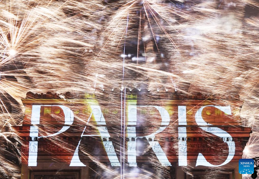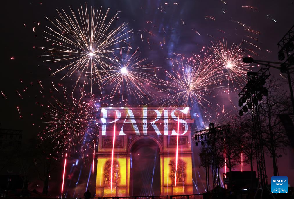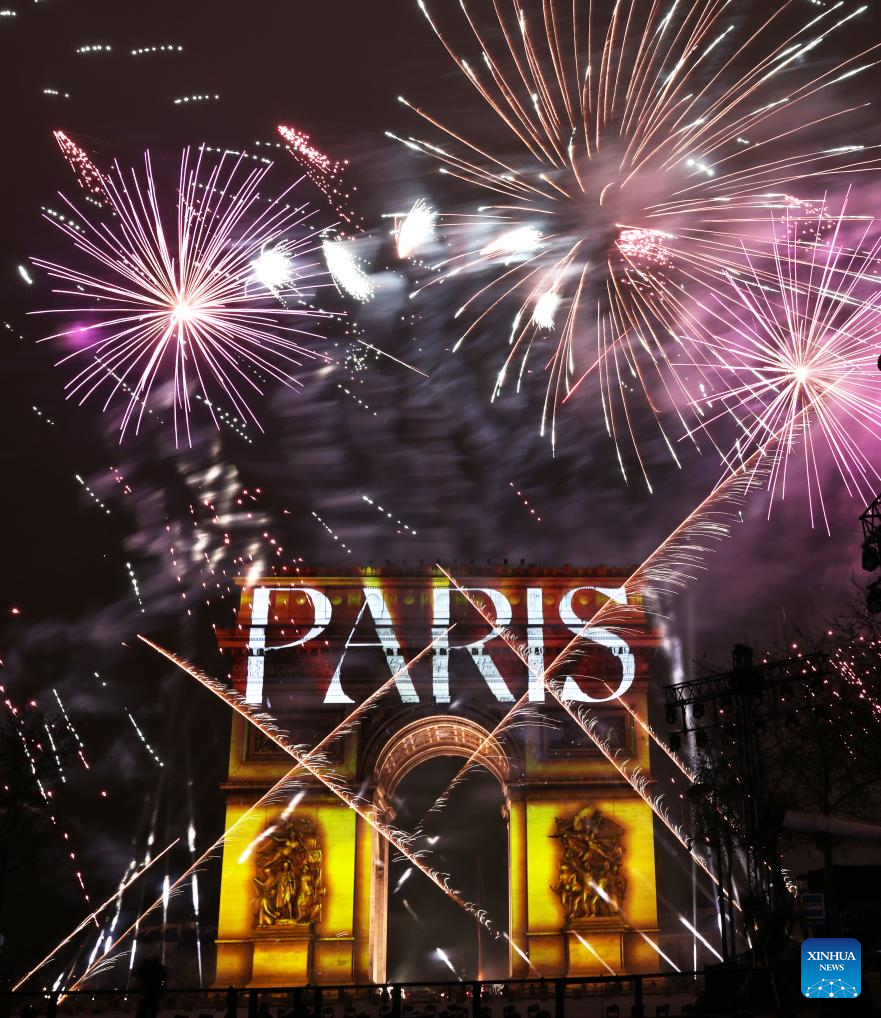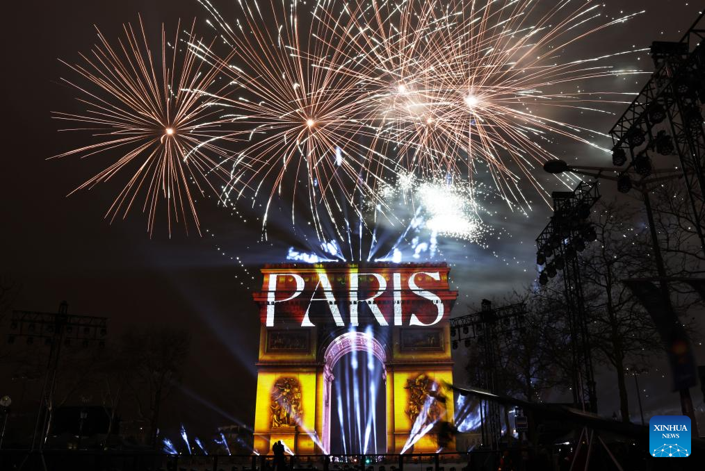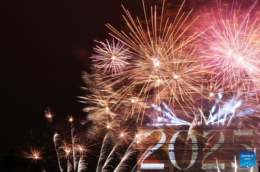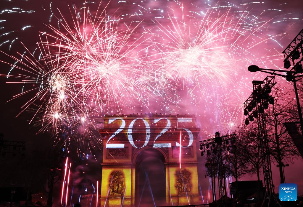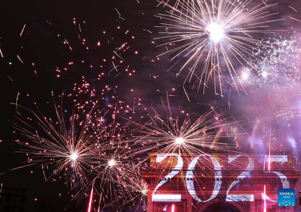 Fireworks explode over the Arc de Triomphe in celebration of the New Year on the Champs-Elysees Avenue in Paris, France, Jan. 1, 2025. (Xinhua/Gao Jing)
