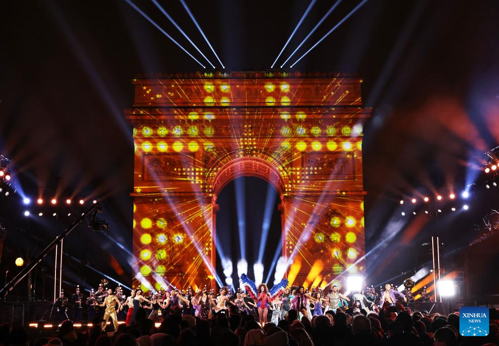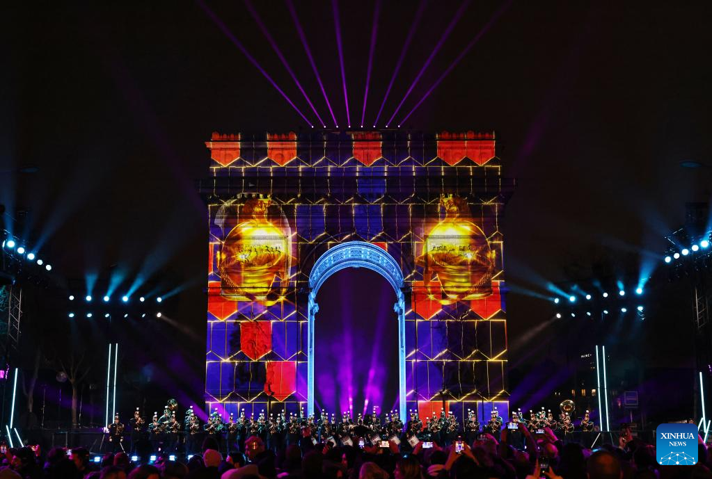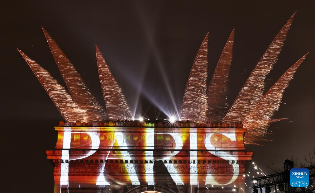 The Arc de Triomphe is illuminated in celebration of the New Year on the Champs-Elysees Avenue in Paris, France, Dec. 31, 2024. (Xinhua/Gao Jing)