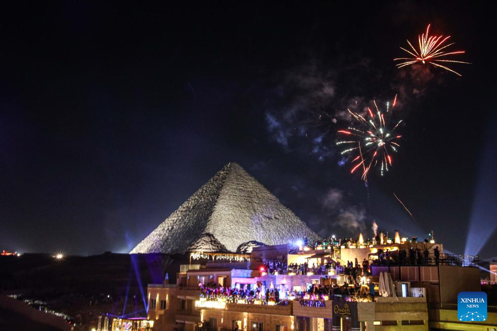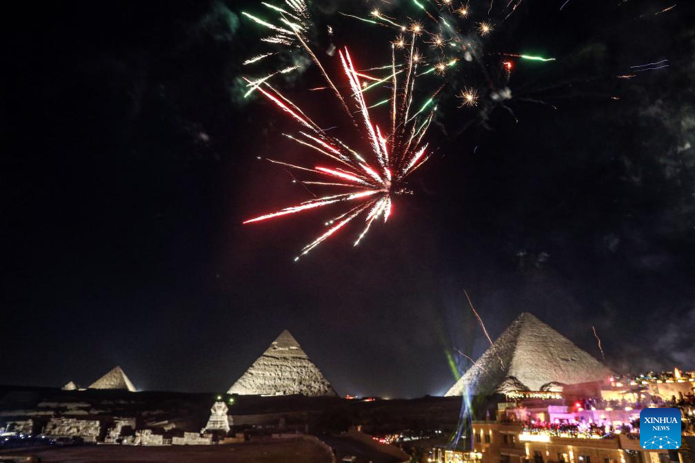 Fireworks explode over the Giza Pyramids to mark the New Year in Giza, Egypt, Dec. 31, 2024. (Xinhua/Ahmed Gomaa)