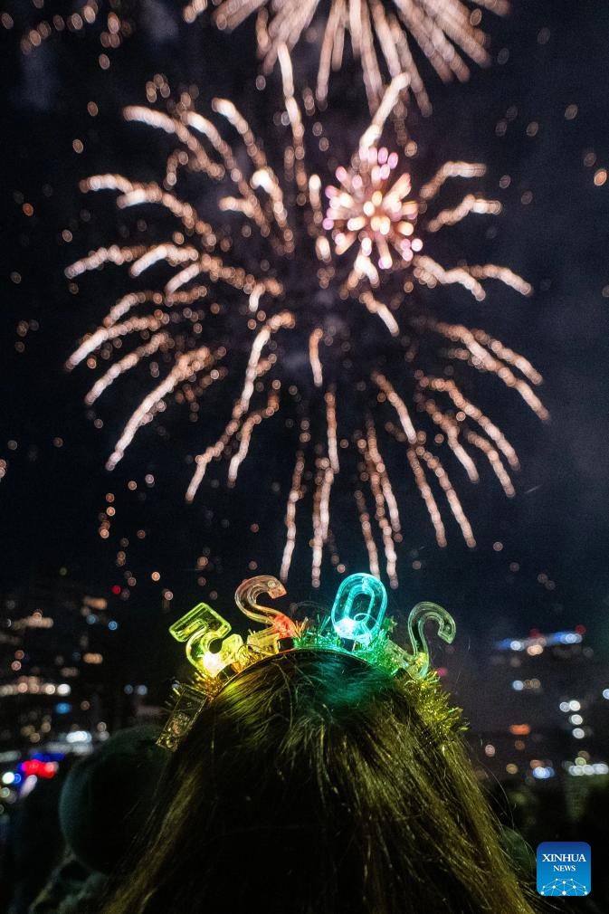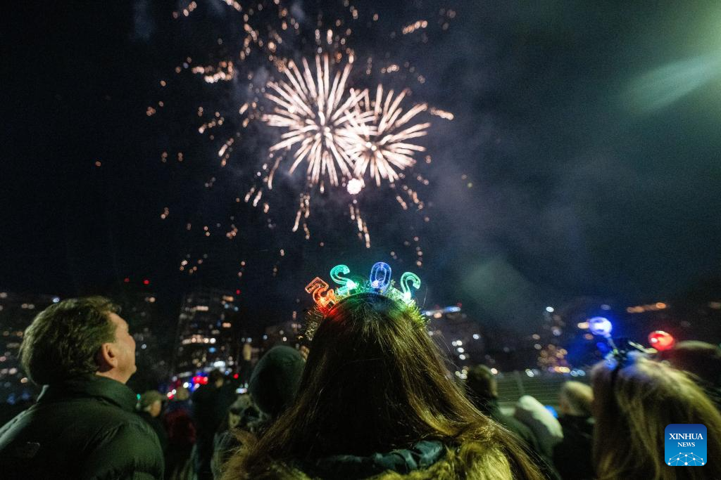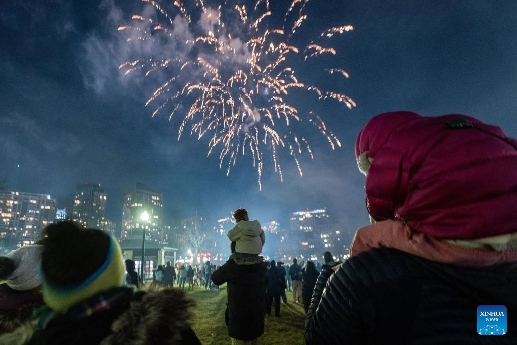 People watch fireworks in celebration of the New Year in Boston, Massachusetts, the United States, Dec. 31, 2024. (Photo by Ziyu Julian Zhu/Xinhua)