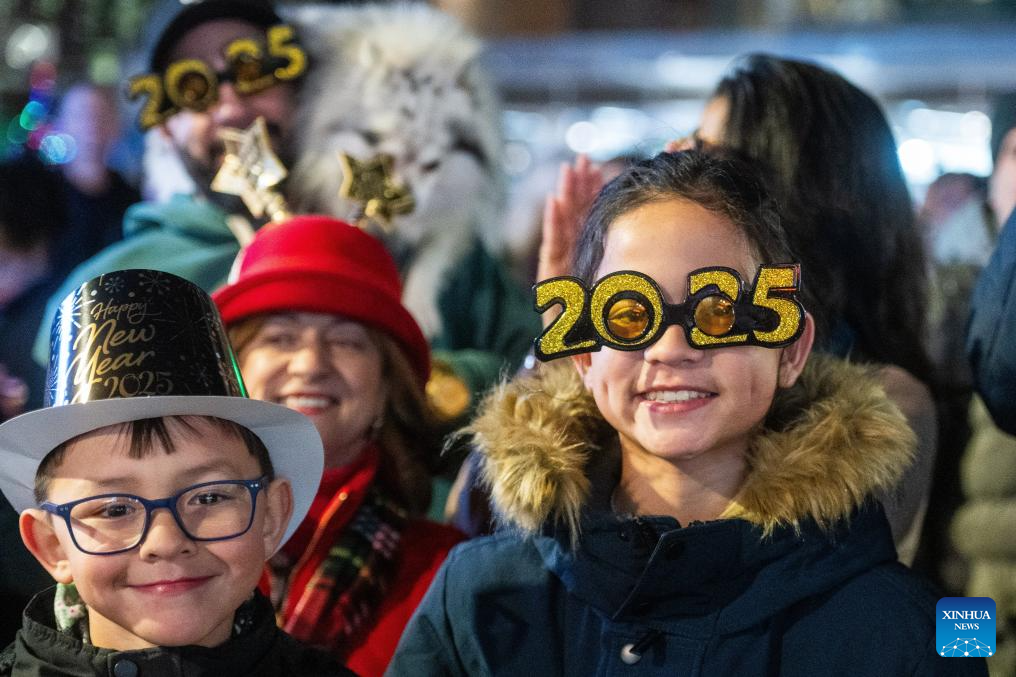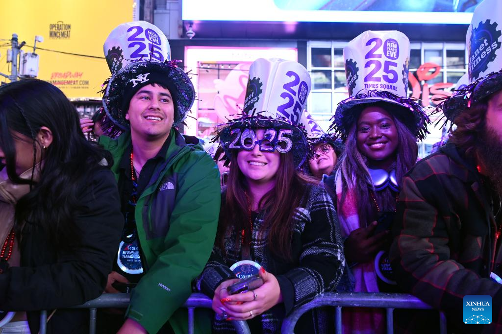 People participate in a New Year celebration at Times Square in New York, the United States, Dec. 31, 2024. (Xinhua/Li Rui)
