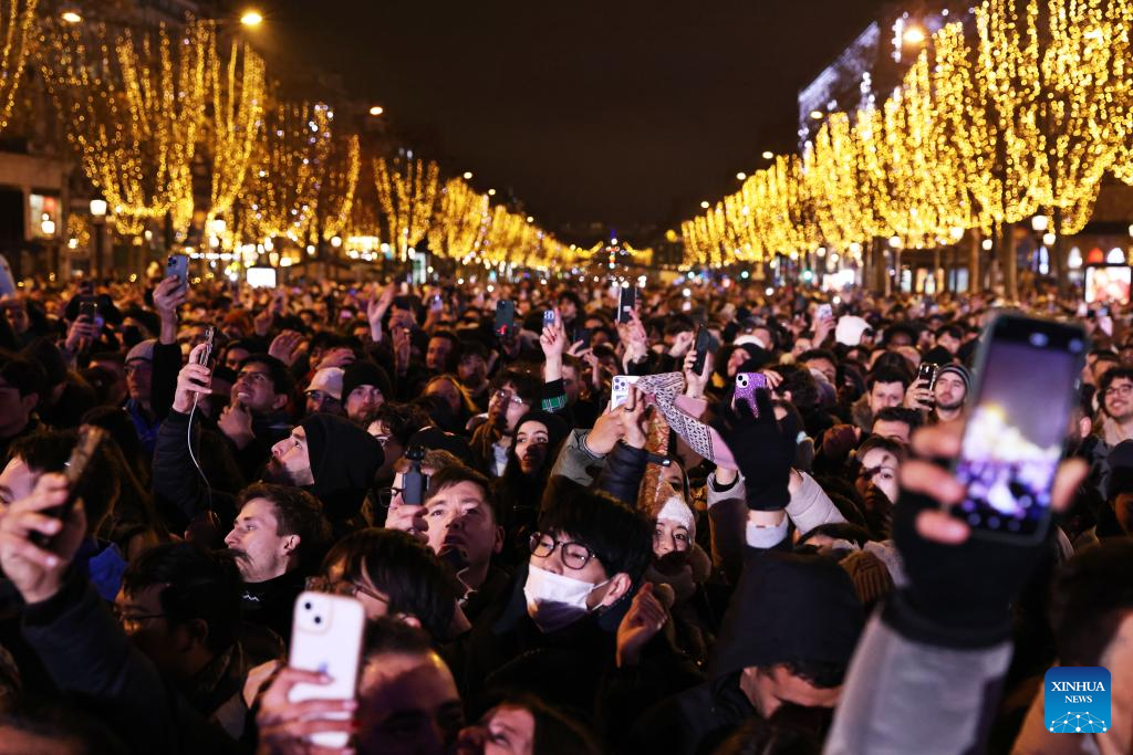 People celebrate the New Year on the Champs-Elysees Avenue in Paris, France, Dec. 31, 2024. (Xinhua/Gao Jing)