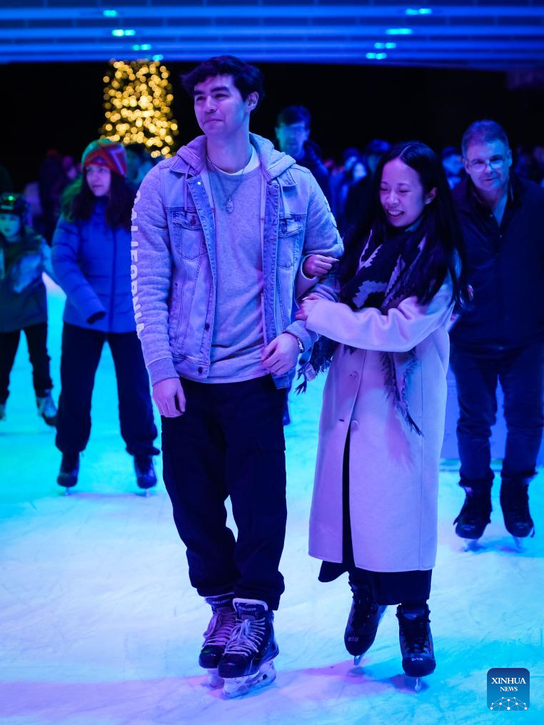 People enjoy ice skating on the New Year's Eve at the Robson Square Ice Rink in Vancouver, British Columbia, Canada, Dec. 31, 2024. (Photo by Liang Sen/Xinhua)