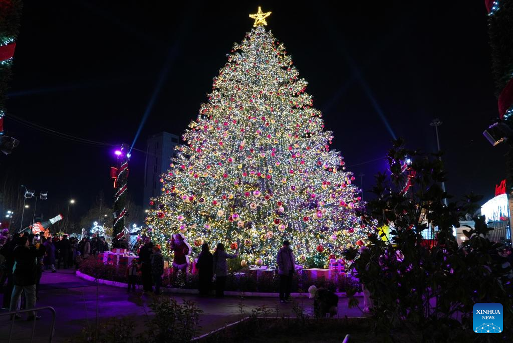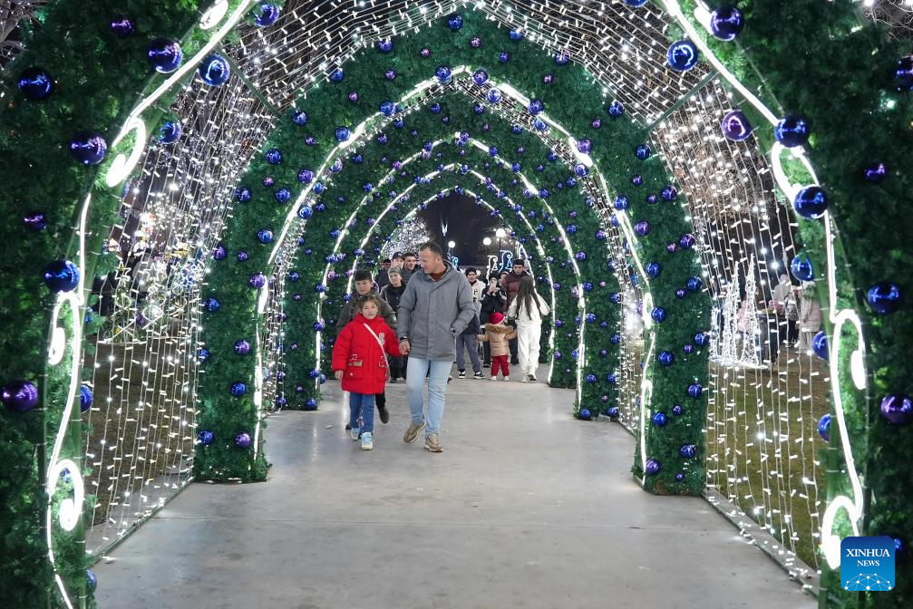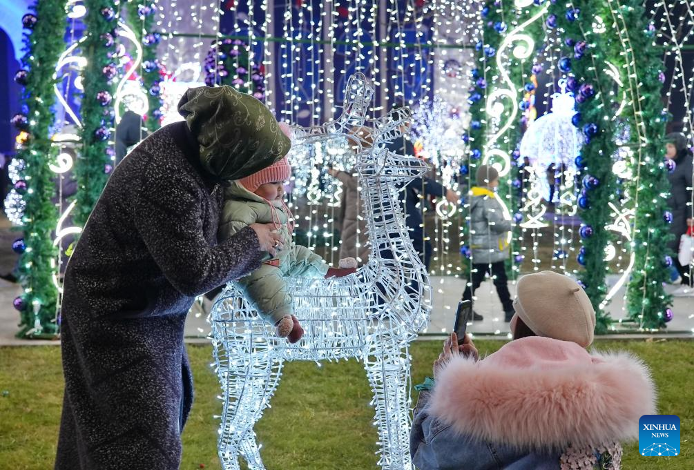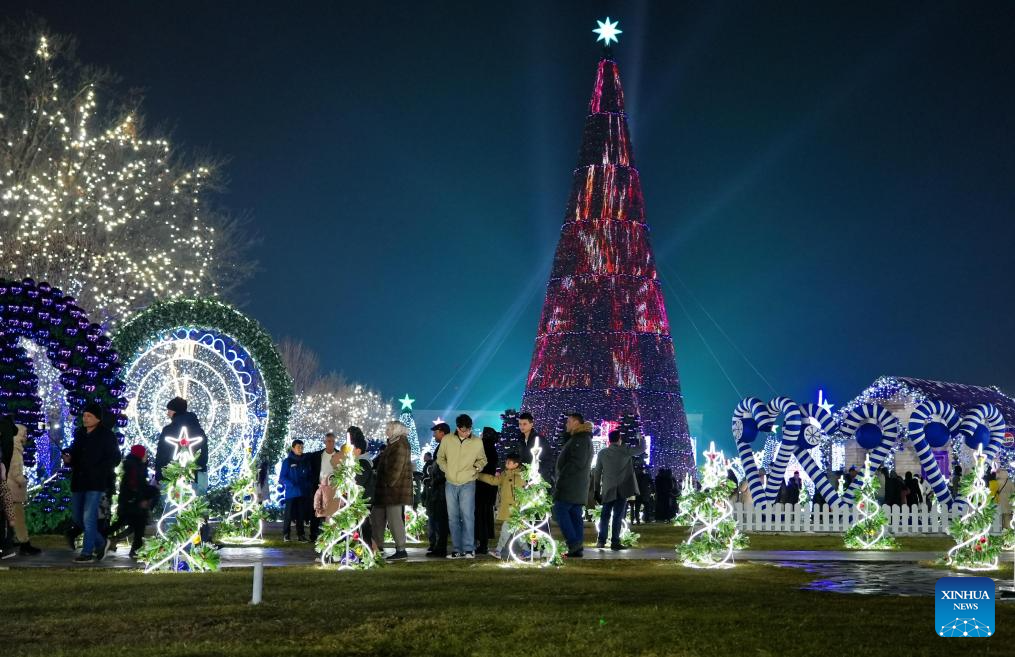 People visit a light show in celebration of the New Year in Tashkent, Uzbekistan, Dec. 31, 2024. (Photo by Zafar Khalilov/Xinhua)