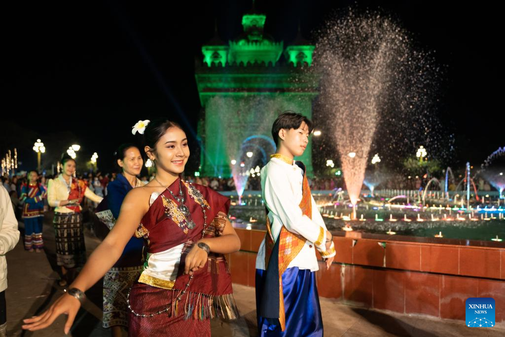 People participate in a New Year celebration at the Patuxay Park in Vientiane, Laos, Dec. 31, 2024. (Photo by Kaikeo Saiyasane/Xinhua)