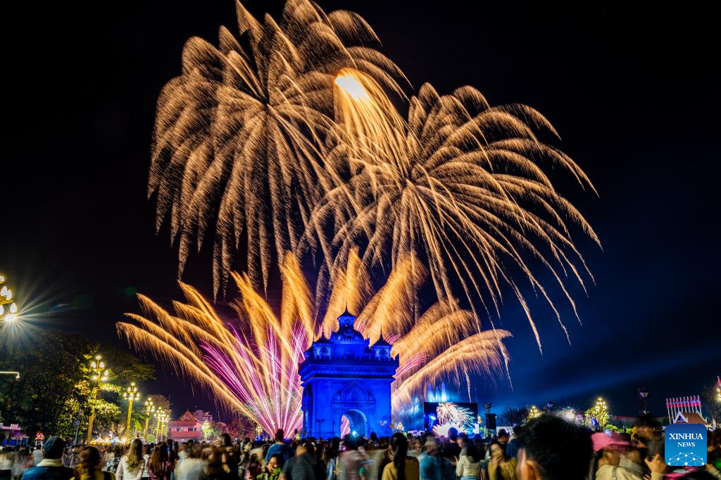 Fireworks explode over the Patuxay monument in Vientiane, Laos, Jan. 1, 2025. (Photo by Kaikeo Saiyasane/Xinhua)