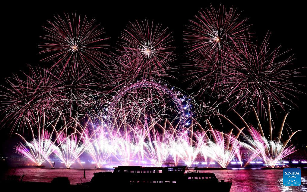 Fireworks explode in front of the London Eye in London, Britain, Jan. 1, 2025. (Xinhua/Li Ying)