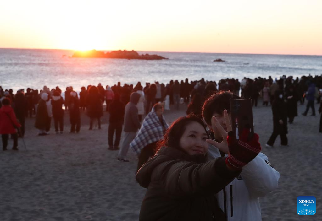 People enjoy the scenery at sunrise on the beach in Gyeongju, South Korea, Jan. 1, 2025. (Xinhua/Yao Qilin)
