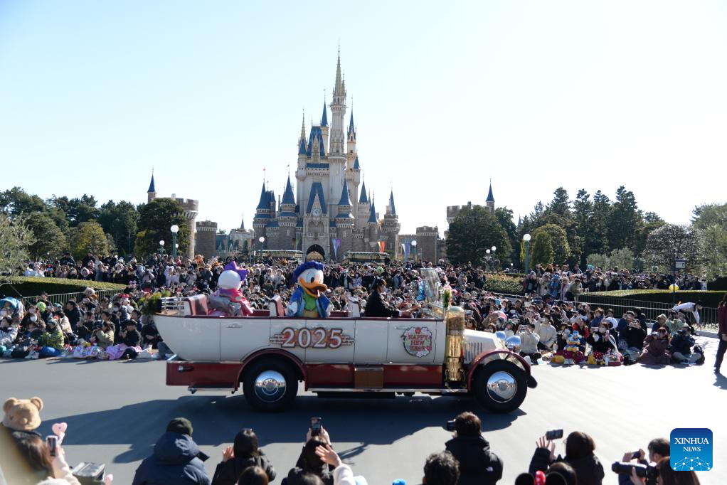 People celebrate the New Year with performers dressed as Disney characters at Tokyo Disneyland in Chiba Prefecture, Japan, Jan. 1, 2025. (Xinhua/Tu Yifan)