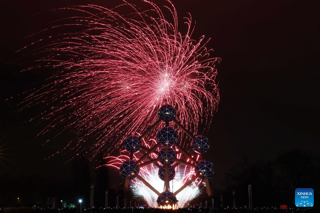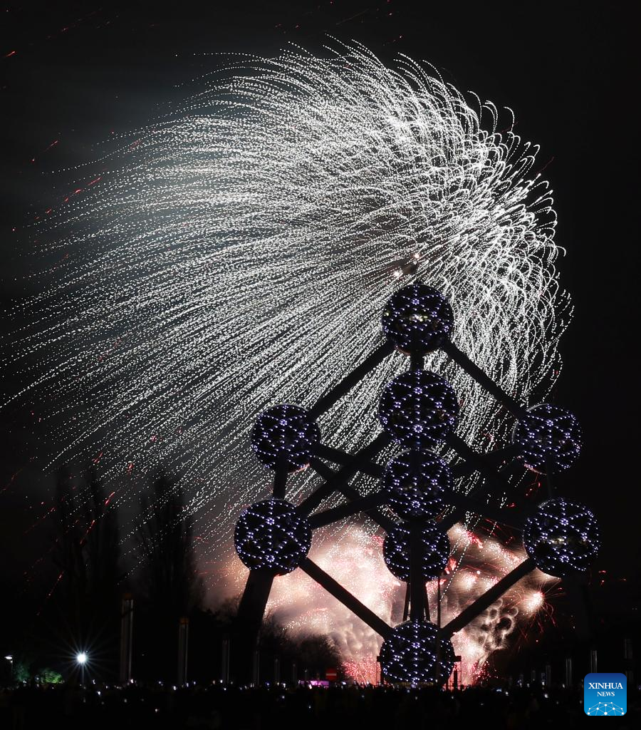Fireworks explode over the Atomium in celebration of the New Year in Brussels, Belgium, Jan. 1, 2025. (Xinhua/Zhao Dingzhe)
