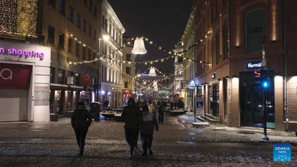 People walk on a street decorated with festive lights in Oslo, Norway, Dec. 31, 2024. (Xinhua/Zhang Yuliang)