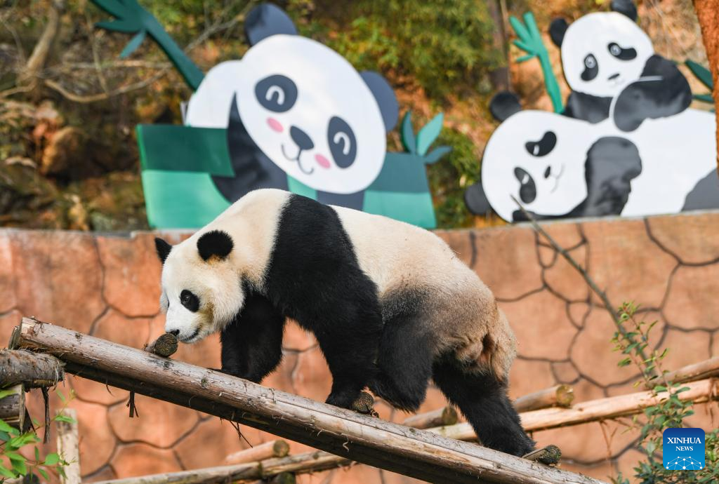 This photo taken on Jan. 1, 2025 shows a panda at Locajoy animal theme park in Yongchuan district of southwest China's Chongqing Municipality. On the first day of the New Year, the Locajoy animal theme park in Chongqing held a celebration for its four giant pandas, marking their first anniversary at the park. (Xinhua/Wang Quanchao)