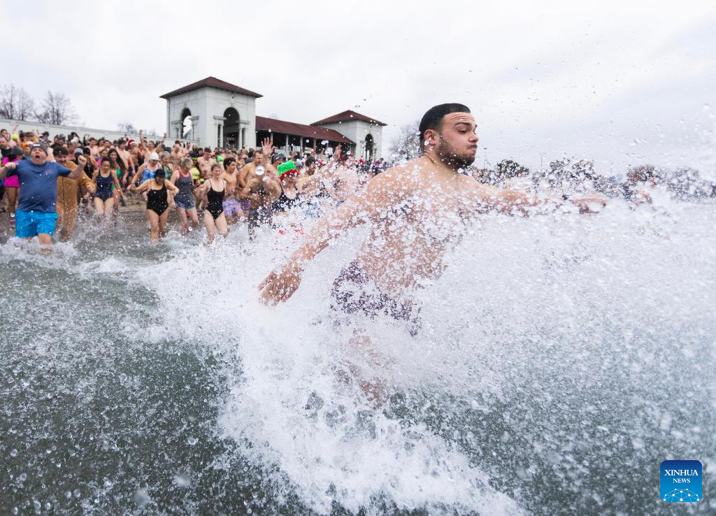 Participants rush into Lake Ontario during the Toronto Polar Bear Dip event in Toronto, Canada, on Jan. 1, 2025. Hundreds of people braved the chilly waters here on Wednesday to celebrate the first day of 2025 and raise funds for charity. (Photo by Zou Zheng/Xinhua)
