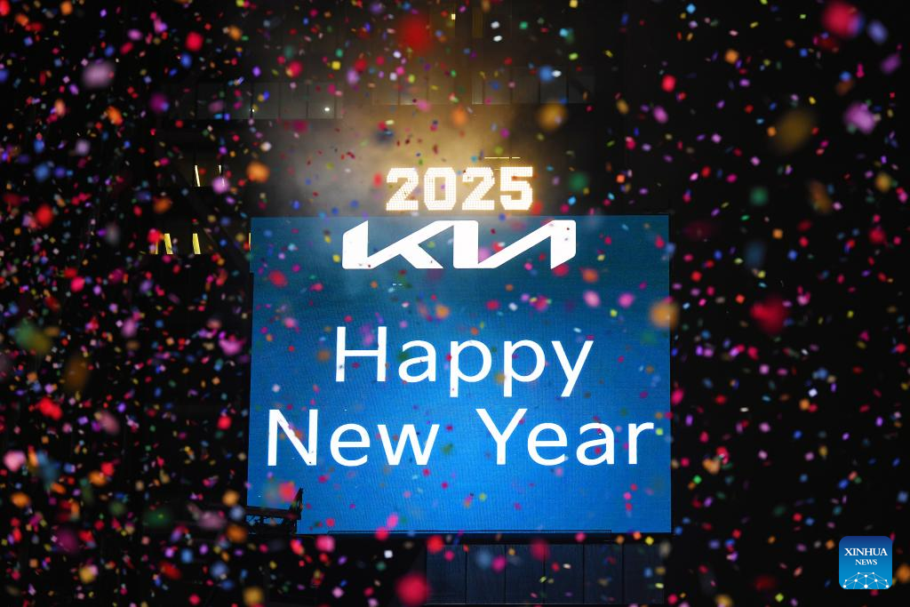 Confetti flies around during a New Year celebration at Times Square in New York, the United States, Jan. 1, 2025. (Xinhua/Li Rui)
