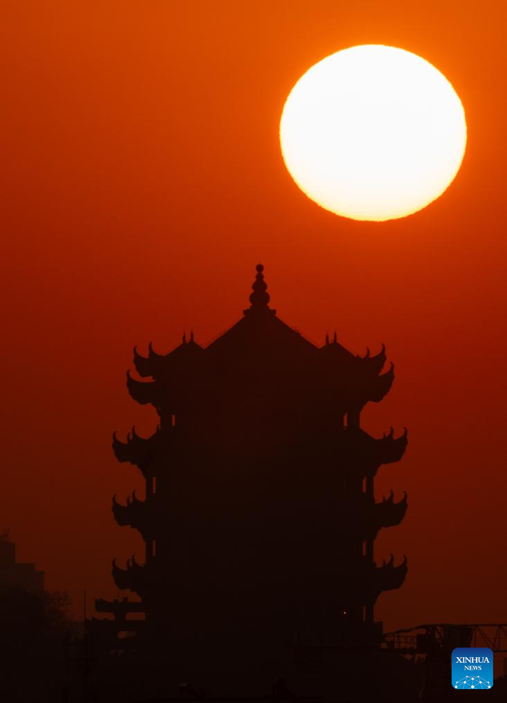 This photo shows the sunrise scenery at the Yellow Crane Tower in Wuhan, central China's Hubei Province, Jan. 1, 2025. (Xinhua/Hu Jingwen)
