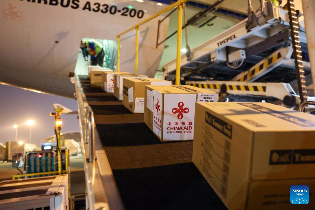Emergency relief supplies with "China Aid" marks are transported onto a plane at Shenzhen Baoan International Airport in Shenzhen, south China's Guangdong Province, Jan. 1, 2025. A shipment of emergency relief supplies departed Wednesday evening from the southern Chinese city of Shenzhen to Port Vila, the capital of Vanuatu, to support earthquake relief efforts in the Pacific island country.
