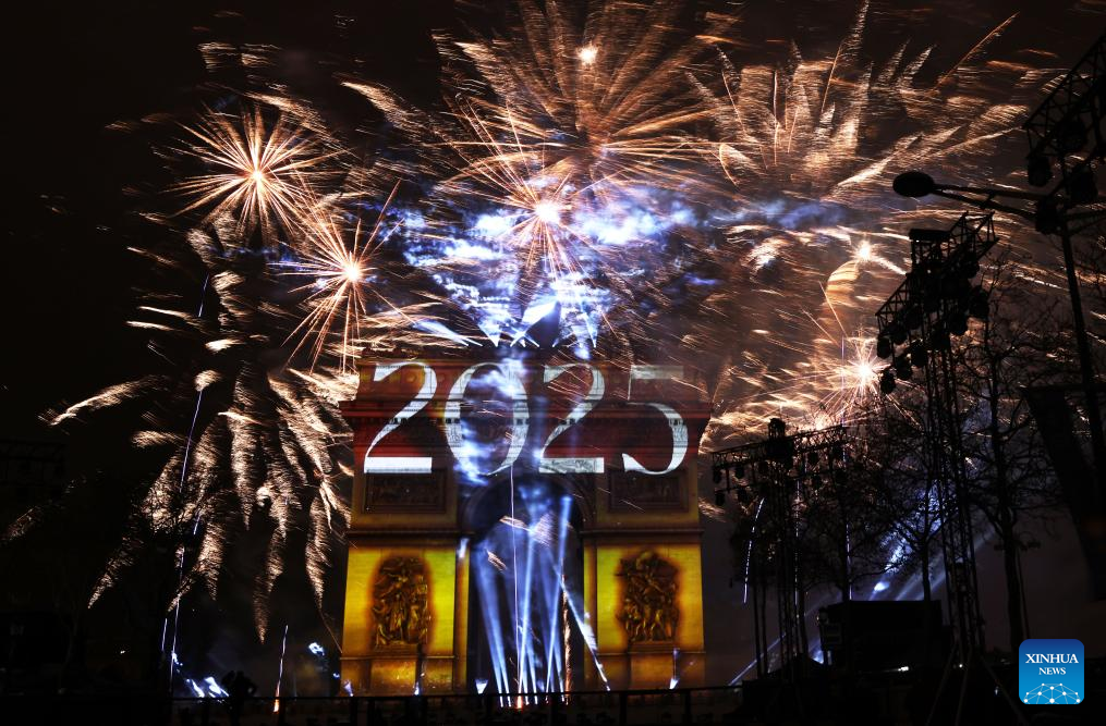 Fireworks explode over the Arc de Triomphe in celebration of the New Year on the Champs-Elysees Avenue in Paris, France, Jan. 1, 2025. (Xinhua/Gao Jing)