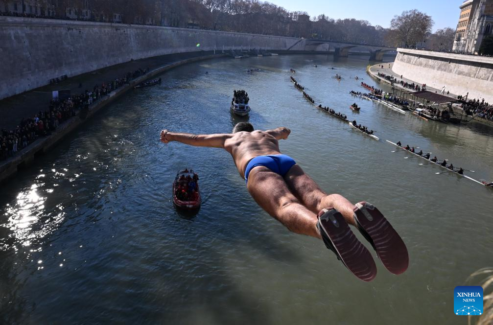 A man dives into the Tiber River from the Cavour bridge as part of traditional New Year celebrations in Rome, Italy, Jan. 1, 2025. (Photo by Alberto Lingria/Xinhua)