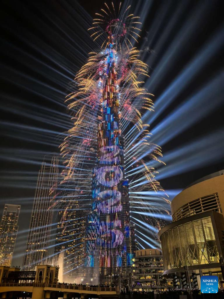 People view fireworks and a light show in celebration of the New Year in Dubai, the United Arab Emirates (UAE), Dec. 31, 2024. (Xinhua/Wen Xinnian)