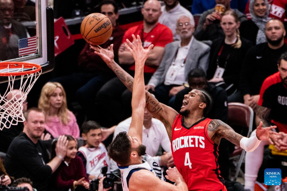 Jalen Green (M) of Houston Rockets blocks a shot during the 2024-2025 NBA regular season match between Houston Rockets and Dallas Mavericks in Houston, Texas, the United States, Jan. 1, 2025. (Photo by Chen Chen/Xinhua)