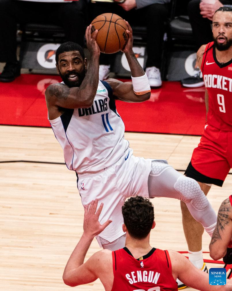 Kyrie Irving (L) of Dallas Mavericks competes during the 2024-2025 NBA regular season match between Houston Rockets and Dallas Mavericks in Houston, Texas, the United States, Jan. 1, 2025. (Photo by Chen Chen/Xinhua)