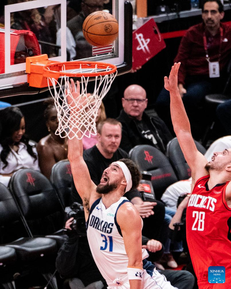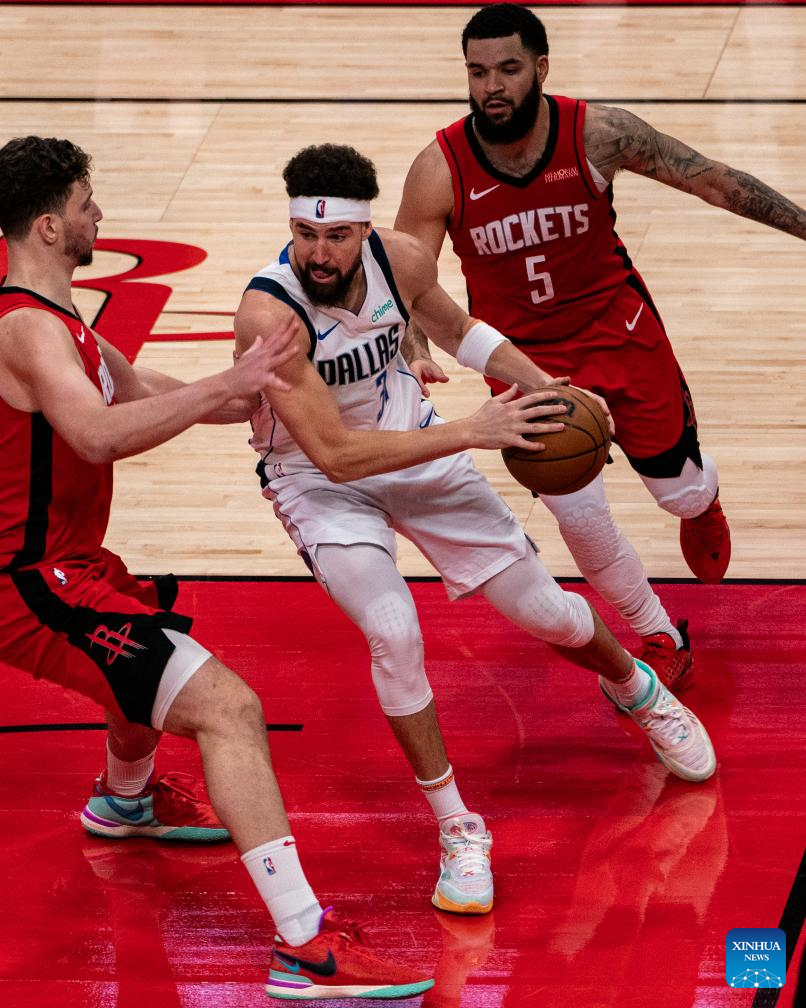Klay Thompson (C) of Dallas Mavericks competes during the 2024-2025 NBA regular season match between Houston Rockets and Dallas Mavericks in Houston, Texas, the United States, Jan. 1, 2025. (Photo by Chen Chen/Xinhua)