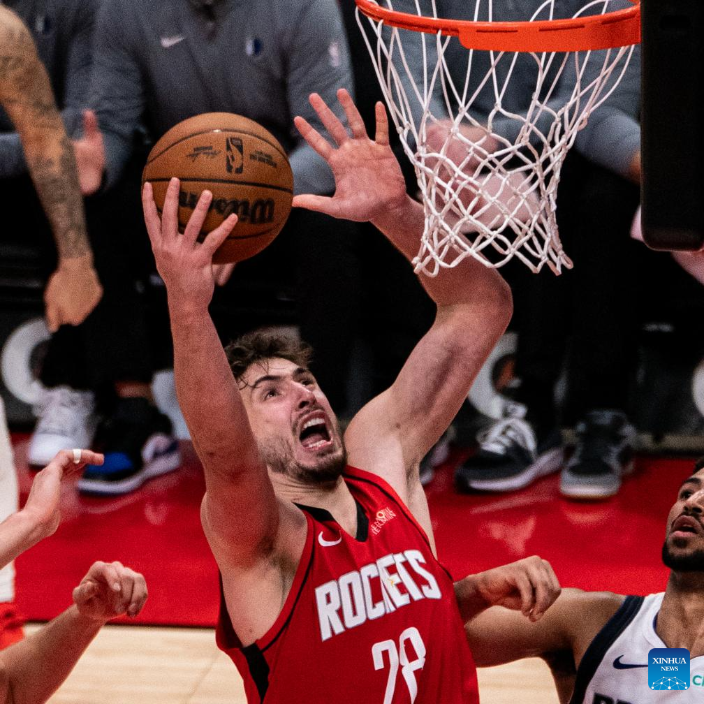 Alperen Sengun (L) of Houston Rockets lays up the ball during the 2024-2025 NBA regular season match between Houston Rockets and Dallas Mavericks in Houston, Texas, the United States, Jan. 1, 2025. (Photo by Chen Chen/Xinhua)