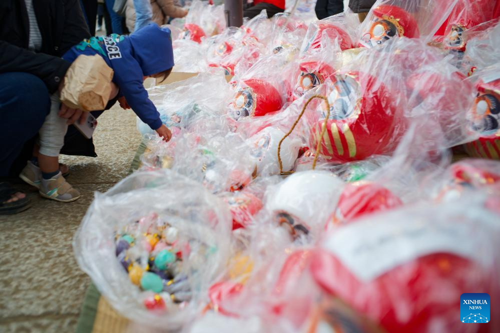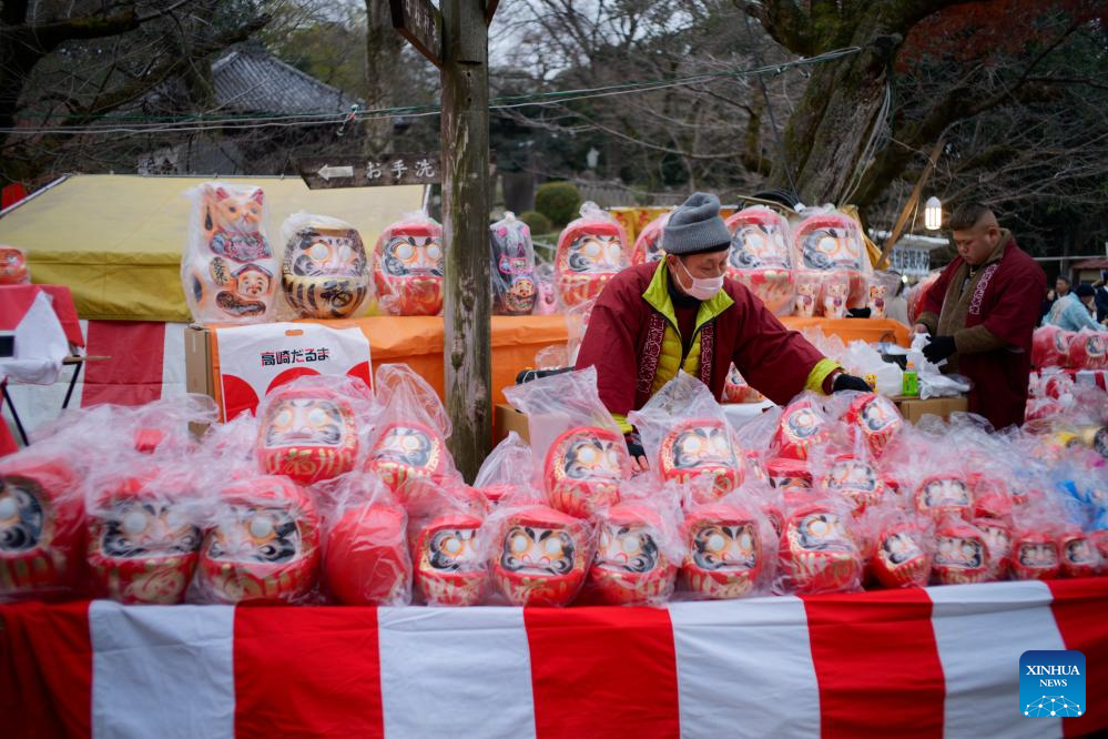 A vendor sorts out Daruma dolls at a Daruma Market in Saitama, Japan, Jan. 3, 2025. Daruma Market is a traditional Japanese event centered around the sale of Daruma dolls, which are widely regarded as symbols of good fortune, perseverance, and success. Such kind of markets are typically held at the beginning of the year. (Xinhua/Zhang Xiaoyu)