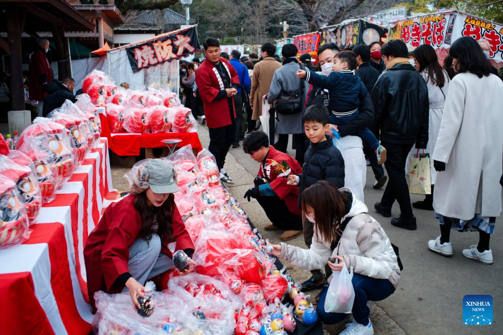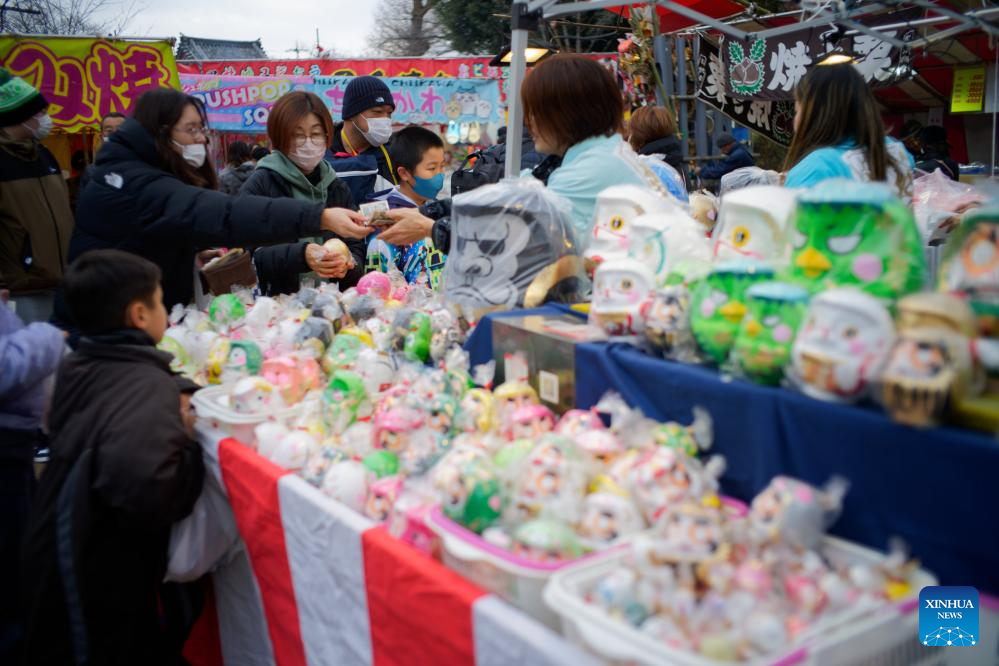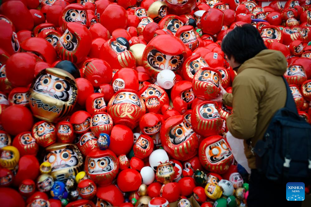 People buy Daruma dolls at a Daruma Market in Saitama, Japan, Jan. 3, 2025. Daruma Market is a traditional Japanese event centered around the sale of Daruma dolls, which are widely regarded as symbols of good fortune, perseverance, and success. Such kind of markets are typically held at the beginning of the year. (Xinhua/Zhang Xiaoyu)