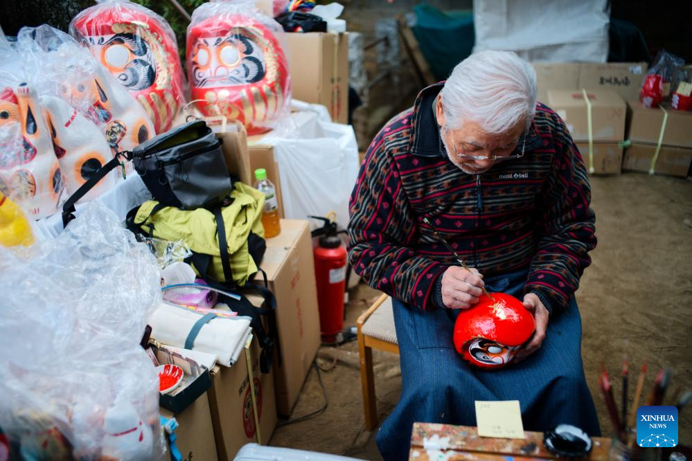 A maker writes down blessings on a Daruma doll at a Daruma Market in Saitama, Japan, Jan. 3, 2025. Daruma Market is a traditional Japanese event centered around the sale of Daruma dolls, which are widely regarded as symbols of good fortune, perseverance, and success. Such kind of markets are typically held at the beginning of the year. (Xinhua/Zhang Xiaoyu)