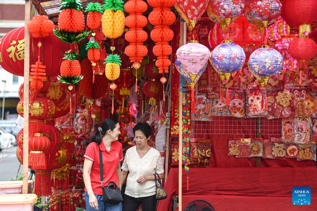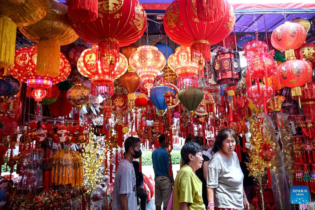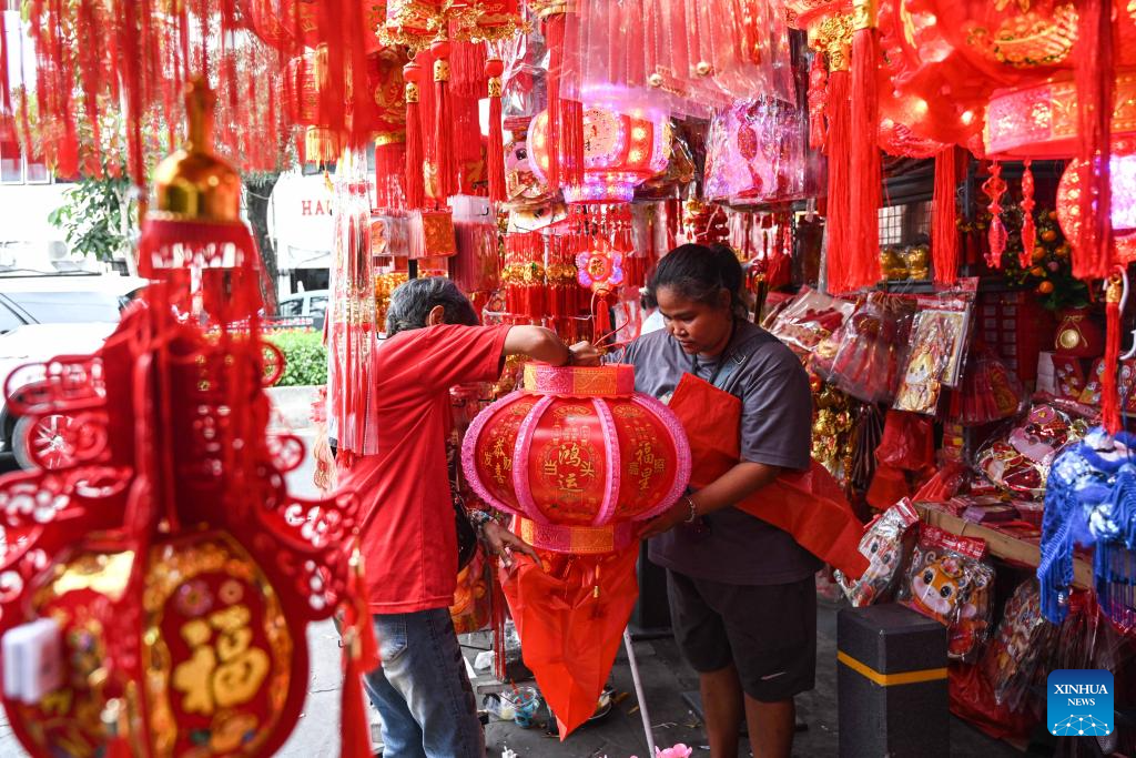 People shop at a street stall selling Chinese New Year decorations in Glodok Chinatown of Jakarta, Indonesia, on Jan. 3, 2025. The upcoming Chinese New Year, or Spring Festival, falls on Jan. 29, 2025. (Xinhua/Agung Kuncahya B.)